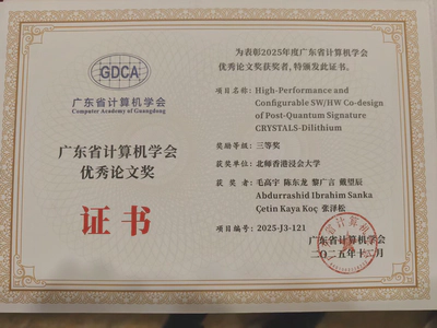 This recognition from the Guangdong Computer Academy—a leading provincial organization advancing computer science research and innovation—underscores the high caliber of CALAS’s work in post-quantum cryptography. The team’s research on CRYSTALS-Dilithium, one of the NIST-selected post-quantum signature schemes, demonstrates innovative hardware-software co-design approaches that achieve both high performance and configurability—critical requirements for practical deployment of quantum-resistant cryptographic systems.